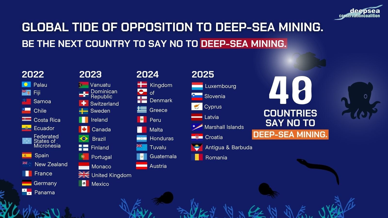 Between roughly 2023 and mid‑2025, the coalition of governments calling for a moratorium, precautionary pause or ban on deep‑sea mining expanded from about two dozen to around 37–40 states, reflecting rapid growth in political resistance to commercial exploitation of the international seabed even as negotiations on the ISA Mining Code continued. Civil‑society trackers and ISA communications emphasize that this support now includes a diverse mix of Pacific SIDS, European states, and Latin American governments, and that the number of governments favouring a halt to mining in the Area already exceeds the number of states on the ISA Council.