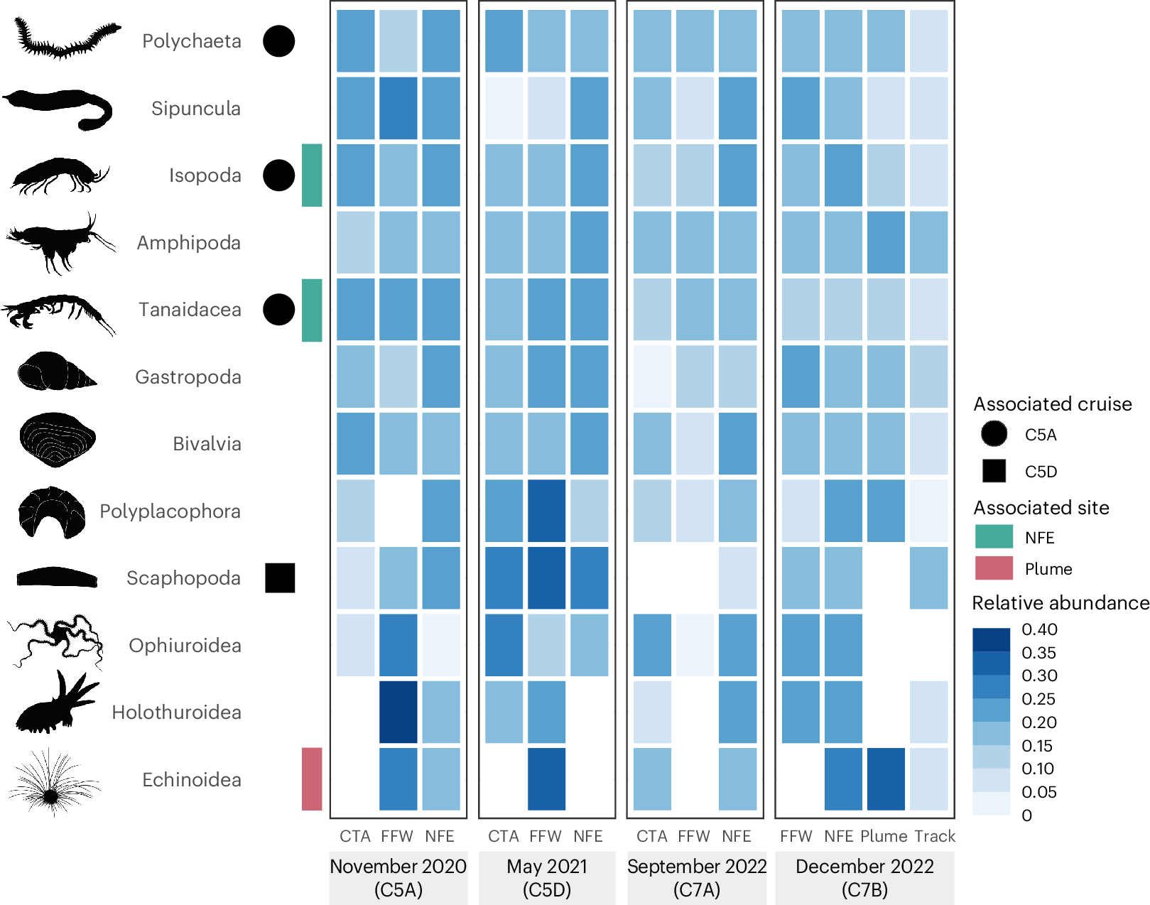 A 2025 paper in Nature Ecology & Evolution reported results from an industrial-scale mining trial in the Clarion–Clipperton Zone. Just two months after the test, sediment-dwelling macrofaunal abundance had declined by roughly one third, with species richness dropping by a similar margin. These losses were not confined to the directly mined tracks. Detectable community shifts were observed even in areas reached only by the sediment plume. Note the decrease in abundance (darker blue to lighter blue) in the figure below pulled from the paper.